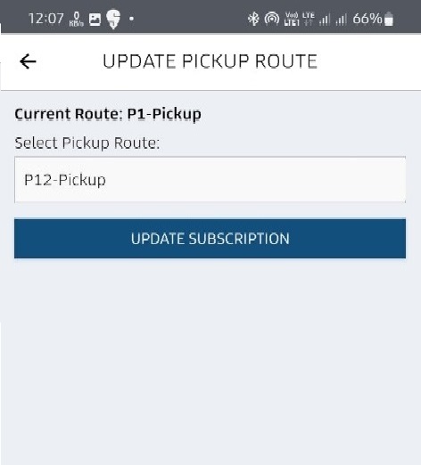 - If the route is not correct, update the route by clicking in the “Select Pickup Route” field, selecting the correct route and then then click on Update subscription. The screen is given near.